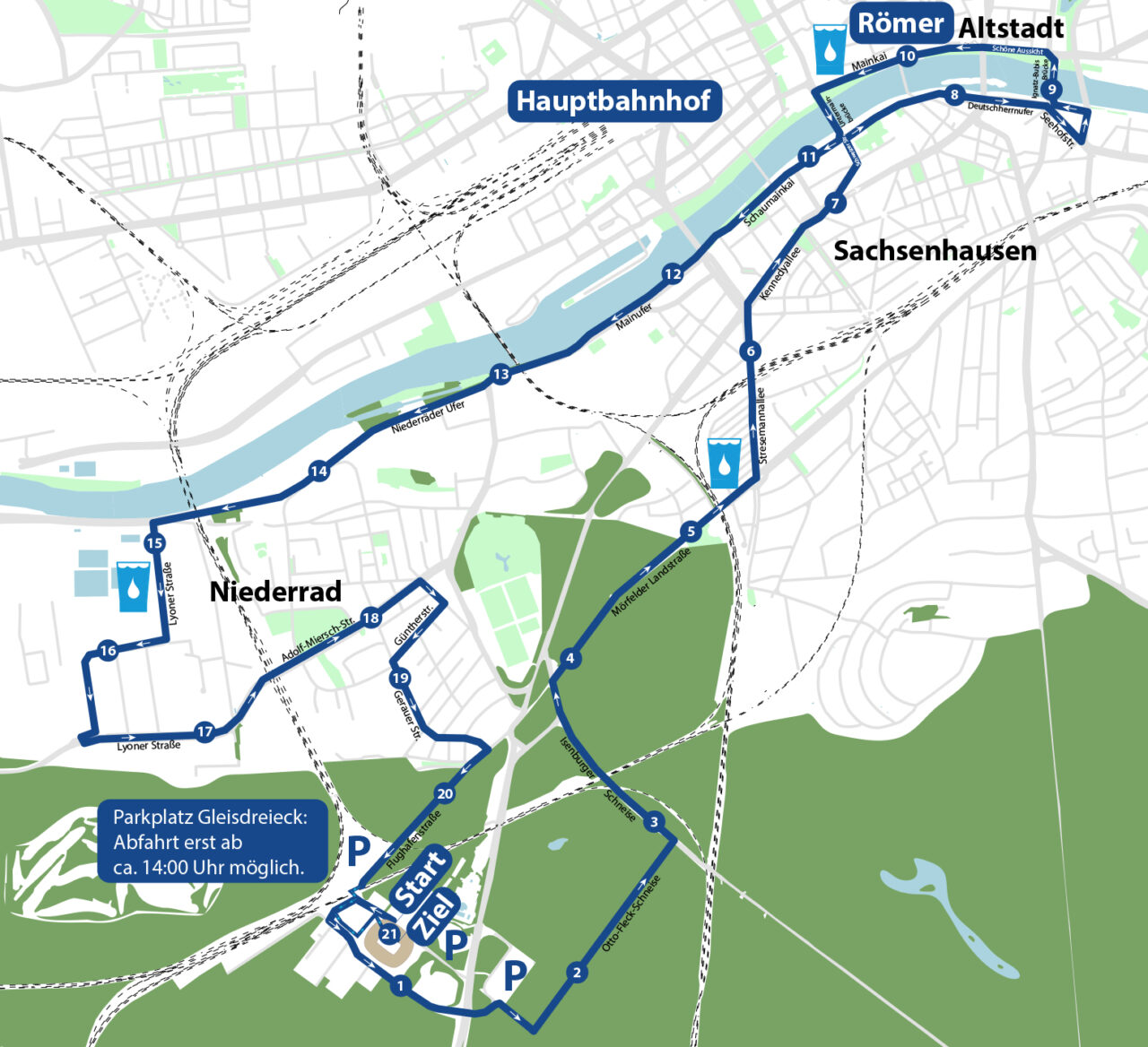 Deutsche Bank Park (Start) – Flughafenstraße – Otto-Fleck-Schneise – Waldparkplatz – Otto-Fleck-Schneise – Isenburger Schneise – Wende zwischen F10 und Schäferschneise – Isenburger Schneise – Mörfelder Landstraße – Stresemannallee – Kennedyallee – Hans-Thoma-Straße – Schweizer Straße – Schaumainkai – Sachsenhäuser Ufer – Deutschherrnufer – Seehofstraße – Wasserweg – Deutschherrenufer – Ignatz-Bubis-Brücke – Schöne Aussicht – Mainkai – Untermainbrücke – Schaumainkai – Vor der Friedensbrücke runter auf den Tiefkai – Tiefkai bis Rampe Theodor-Stern-Kai – Radweg Theodor-Stern-Kai – Niederräder Ufer – Lyoner Straße – Adolf-Miersch-Straße – Triftstraße – Schwarzwaldstraße – Güntherstraße – Gerauer Straße – Reichsforststraße – Flughafenstraße – Deutsche Bank Park (Ziel)